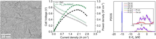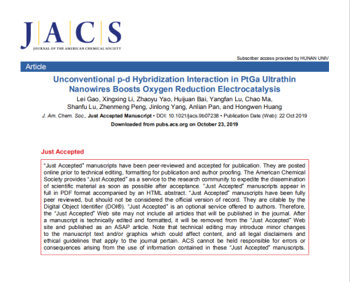 针对铂基合金催化剂的耐久性问题,黄宏文教授团队提出通过掺入p区金属元素来构筑强的p-d轨道杂化相互作用,从而抑制合金催化剂的组分的溶解析出,实现高的催化耐久性?;诰哂衟-d轨道杂化相互作用的PtGa超细合金纳米线,团队结合实验证据和理论模拟计算证明了Pt与Ga之间的p-d轨道杂化的强相互作用是其高活性及耐久性的根本原因。此外,团队将Pt4.31Ga合金纳米线作为阴极催化剂组装成质子交换膜燃料电池进行单电池测试,结果表明其最大功率密度高于商用的Pt/C催化剂,证明了该催化剂在质子交换膜燃料电池中的巨大应用潜力。该项研究工作不仅发现了新的高效催化剂,而且为未来的高效催化剂的设计提供了新的设计方法。该研究工作以“Unconventional p-d Hybridization Interaction in PtGa Ultrathin Nanowires Boosts Oxygen Reduction Electrocatalysis”为题发表在《Journal of the American Chemical Society》(IF=14.695)上。论文的共同第一作者是湖南大学2018级博士研究生高磊和中国科学技术大学的李星星博士,黄宏文教授为通讯作者,美国阿克伦大学彭振猛教授为共同通讯作者,论文第一单位是湖南大学材料科学与工程学院。