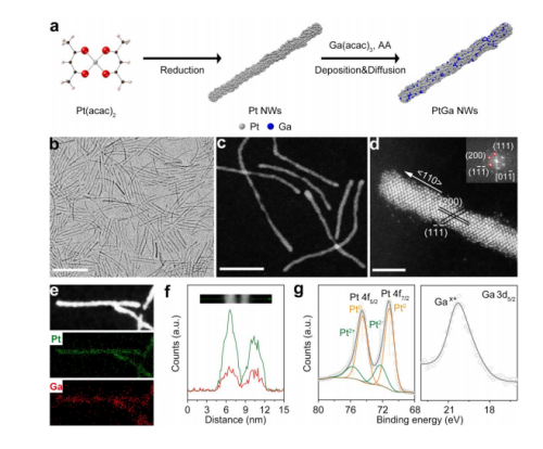 在电化学合成氨方面(NRR),团队与材料学院马超教授及深圳大学曾昱佳教授合作,所合成出多重孪晶的Pd3Pb金属间化合物纳米线在电化学合成氨方面展示出高的法拉第效率和产率,该成果发表在材料化学领域的著名期刊